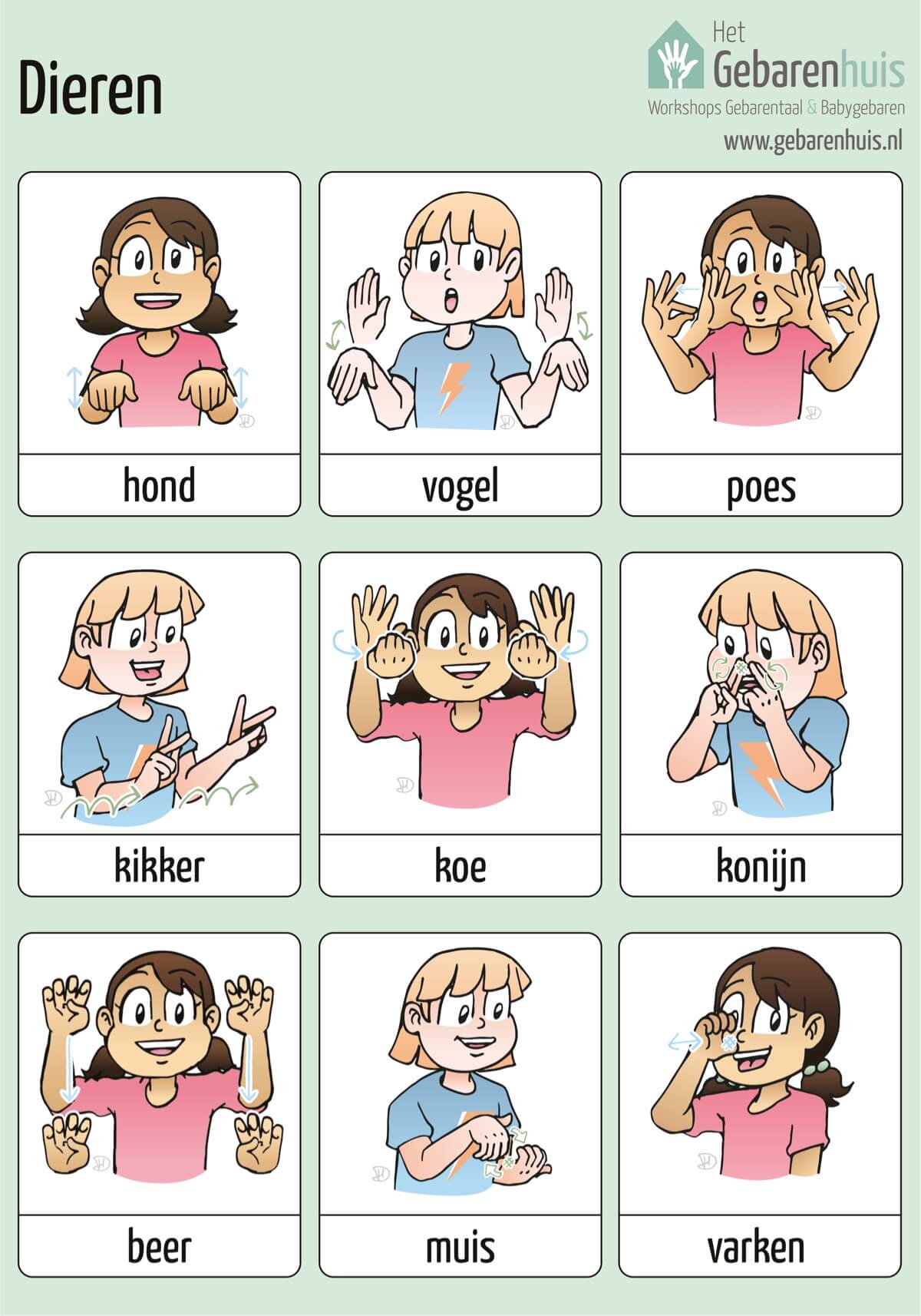 Gebarenposter met de gebaren: hond, vogel, poes, kikker, koe, konijn, beer, muis en varken.